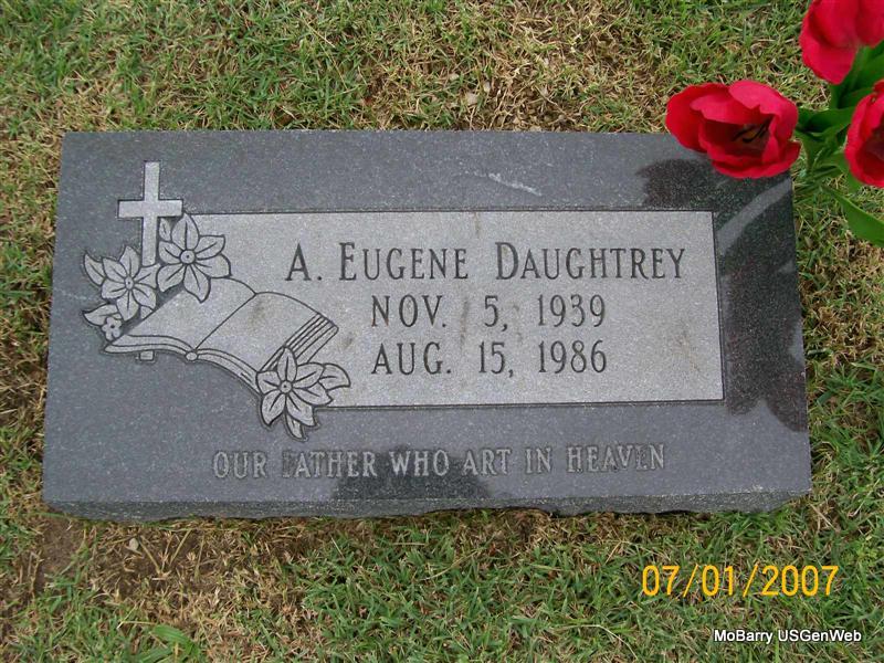 | DAUGHTREY, Arthur Eugene | Nov. 5, 1939 | Aug. 15, 1986 | Research Note: He is buried in the 1st Section, Block 41, Lot 1, Grave 2, next to Lisa Jo Daughtrey. Lot owner was Charles A. Daughtery. The funeral home was Meador of Republic, MO. Arthur Eugene Daughtrey, age 21, first married Jo Ann Ingle, age 16, on Dec. 31, 1960 in Monett, Lawrence Co., MO. Verenai Ingle, mother of Jo Ann, gave consent. At age 38, Arthur married Virginia Grace (McCormick) Reed, age 41, on Dec. 9, 1977 in Laclede Co., MO. | IOOF Log Book MO Marriage Records Phyllis Long Photo Jay Trace |