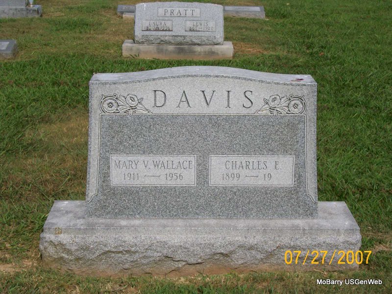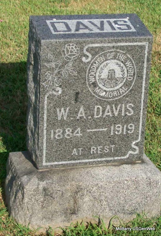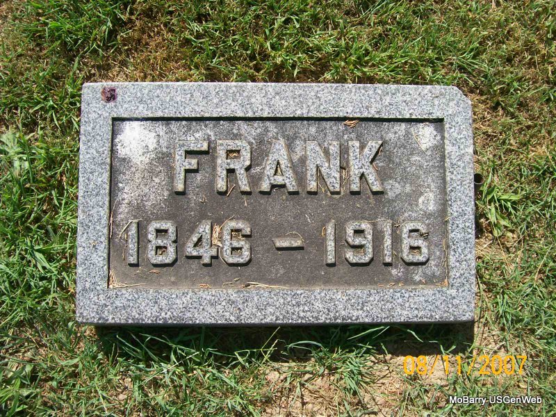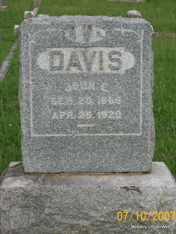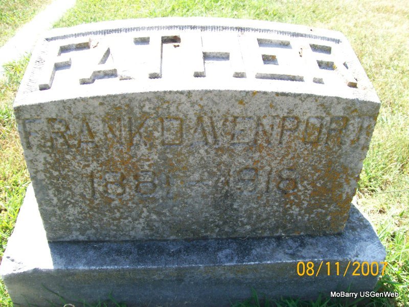 | DAVENPORT, Frank William | Oct. 13, 1881 | Mar. 21, 1918 | Inscription: "Father" - Research Note: He is buried next to Bettie (Pratt) Stephens and his stone matches hers. The cemetery log book reads that W. Frank Davenport was buried in IOOF Cemetery Mar. 5, 1918 and that Clara Davenport purchased the cemetery lot. He is in the old section in block 58 in lot 1, grave 8 in the S 1/2. - His mother was Minerva Davenport. William F. Davenport married Clara Pratt on June 4, 1907 in Carthage Jasper Co., MO. Betty was the sister of Clara Pratt, Frank's wife. Clara may be buried as Clara Robinson in IOOF Cemetery. | Note Donna Cooper Census MO Marriage Records Phyllis Long Photo Jay Trace |