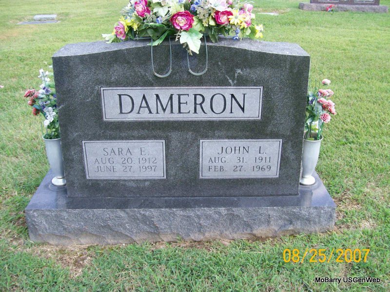 | DAMERON, John Lee | Aug. 31, 1911 | Feb. 27, 1969 | SSW: Sara E. - Research Note: Son of John Lee Dameron and Anna E. Everett. His wife was Sarah E. Adams. | Census Phyllis Long Photo Jay Trace |