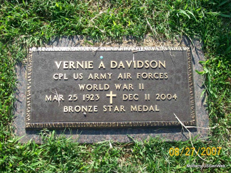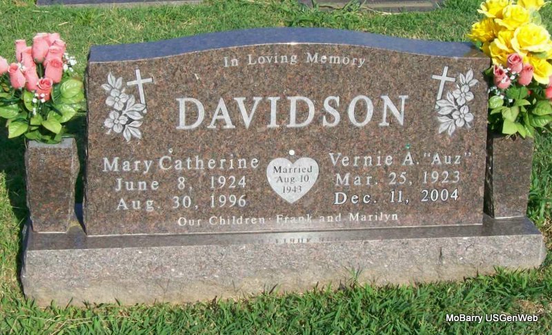 SSW: Mary Catherine - Inscription: "Married Aug. 30, 1943" - Research Note: Son of Vernie R. and Myrtle Pearl (Tracy) Davidson, Air Force veteran of World War II, married Mary Catherine Flaherty on August 10, 1943, and she preceded him in death August 30, 1986. - Military Stone - Inscription: "CPL US ARMY AIR FORCES WORLD WAR II - BRONZE STAR MEDAL" | Monett Times Dec. 13, 2004 Mary Homesley Photo Jay Trace |