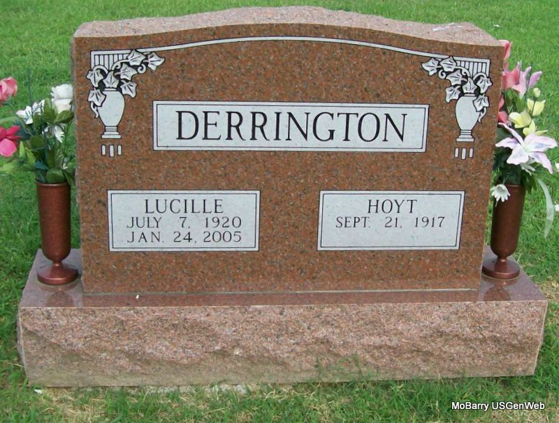 SSW: Hoyt - Research Note: Lucille Derrington, age 84, of Monett, died January 24, 2005 at Cox Monett Hospital. She was born July 7, 1920, in Monett, the daughter of C. S. and Hattie (Worming ton) Haddock. She was a homemaker. She was a member of the First Baptist Church and Etta Gardner Garden Club. She married Walter Hoyt Derrington on October 15, 1940, in Monett. She was preceded by four sisters and five brothers. | Monett Times Jan. 26, 2005 Donna Cooper Photo Jay Trace |