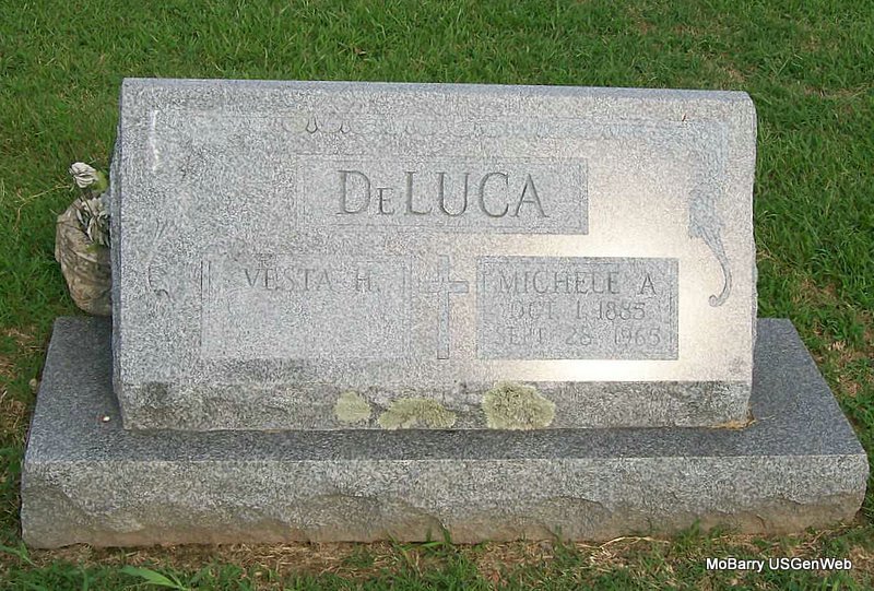 | DELUCA, Michele A. | Oct. 1, 1885 | Sept. 28, 1965 | SSW: Vesta H. - Research Note: SSDI gives his last residence as KS. SSN issued in TX. - 1940 Census, Dallas, Dallas, Texas - Michael Deluca, head, age 55, born Italy, worked on oil pipe line; Vesta, wife, age 41, born MO. - They are in Ashland, KY in 1944 as pipe fitter. | SSDI Census City Directories Phyllis Long Photo Jay Trace |