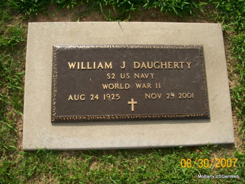 Research Note: William James "Bill" Daugherty, age 76, of Joplin, formerly of Monett, died November 29, 2001 at Freeman Hospital in Joplin, MO. He was born August 24, 1925, in St. Louis, and was a son of William Jacob and Evelyn J. (Follen) Daugherty. He had lived in Joplin since 1966, moving from Monett. He operated Daugherty Photography Studio in Monett for 13 years and worked in sales at Wal-Mart in Joplin from 1972 until retiring in 1988. He was a member and past president of the Monett Jaycees, and a member of Disabled American Veterans and Immanuel Lutheran Church. He was a Navy veteran of World War II and delivered meals on wheels for the Joplin Senior Citizens Center. He married Betty Teaford on July 25, 2001, in Joplin. - Military Photo - Inscription: "S2 US NAVY WORLD WAR II" | Note Donna Cooper Photos Jay Trace |