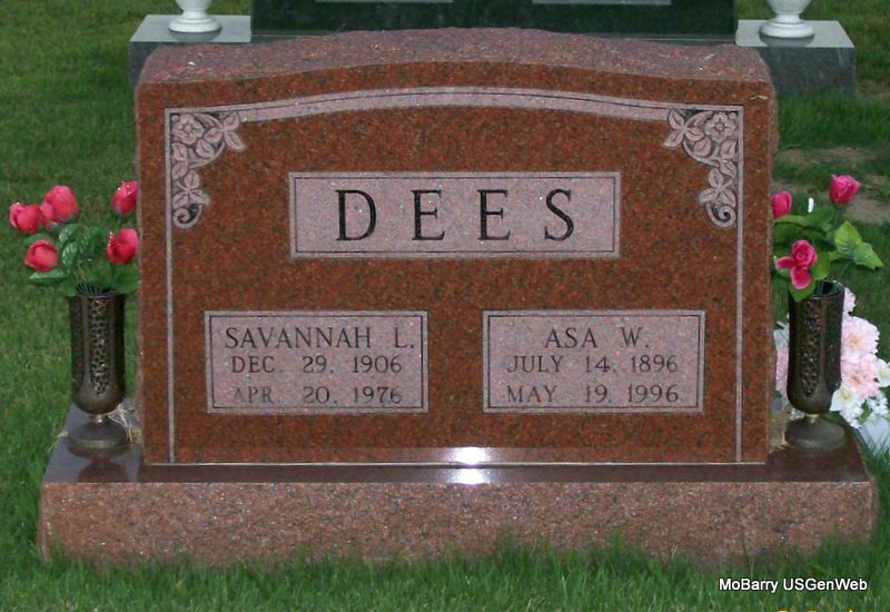 | DEES, Asa W. | July 14, 1896 | May 19, 1996 | SSW: Savannah L. - Research Note: The cemetery log book has him as a veteran. Asa Dees first married Stella Witt on Mar. 29, 1921 in Greenville, Wayne Co., MO. Son of Henry R. Dees and Nancy A. Henderson. | IOOF Log Book MO Marriage Records Census Phyllis Long Photo Jay Trace |