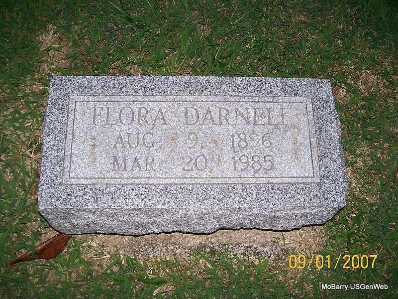 | DARNELL, Flora (PERRY) | Aug. 9, 1896 | Mar. 20, 1985 | Research Note: Perry probably not her maiden name. Flora Perry, age 63, married Arnia Darnell, age 70, on Sept. 9, 1959 in Monett, Lawrence Co., MO. | MO Marriage Records Phyllis Long Photo Jay Trace |