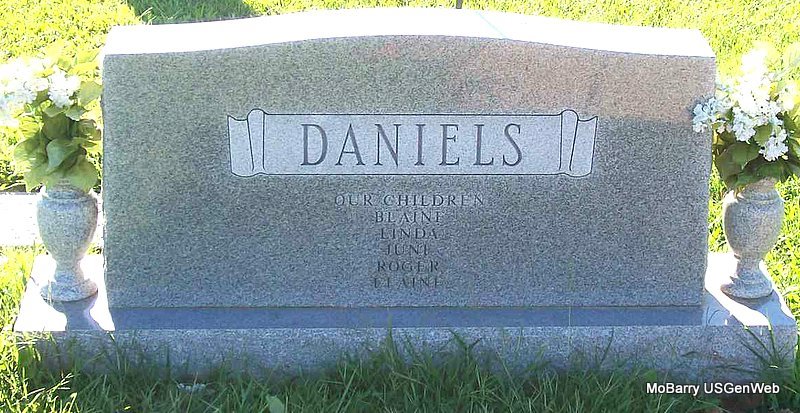 SSW: C. Virginia - Inscription: "Married Mar. 1, 1941" - Research Note: Son of Delmar and Blanche (Shepherd) Daniels, was preceded in death by a son, Blaine Daniels, on January 17, 1994. Donna's Post: He was a life-long area resident. He was a retired mold repairer for Wells Aluminum, Inc., and an auto mechanic. He married Virginia Henson Daniels on March 1, 1941 in Galena. - Back of Stone | Monett Times June 7, 2001 Mary Homesley Obit Donna Cooper Photos Jay Trace |