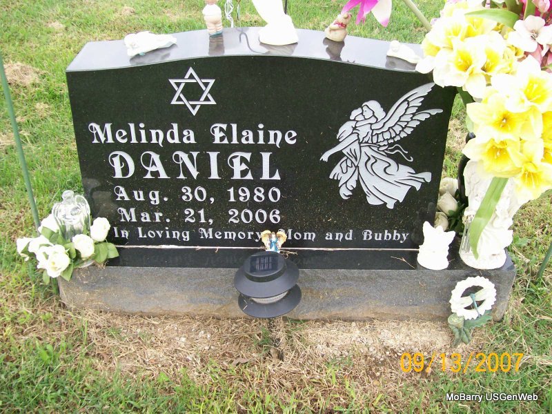 Research Note: Melinda Elaine Daniel, age 25, of Monett, died March 21, 2006 at St. John's Regional Health Center in Springfield, MO and was born September 30, 1980, in Neosho. She attended Monett High School and was a Methodist. Daughter of Allen Daniel and Dora Elaine (Gillespie) Daniel. - Back of Stone | Monett Times Mar. 22, 2006 Donna Cooper IOOF Log Book Phyllis Long Photos Jay Trace |