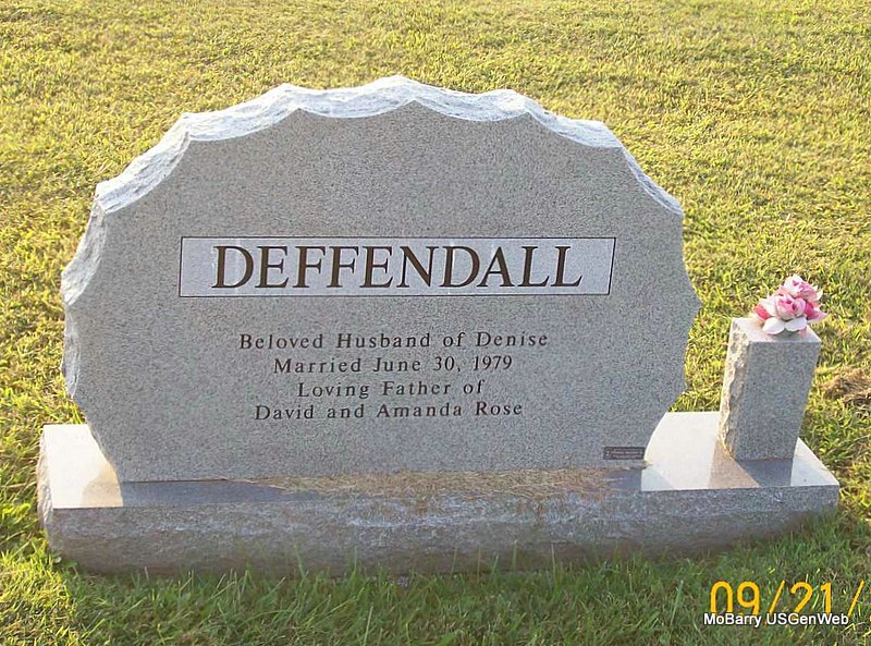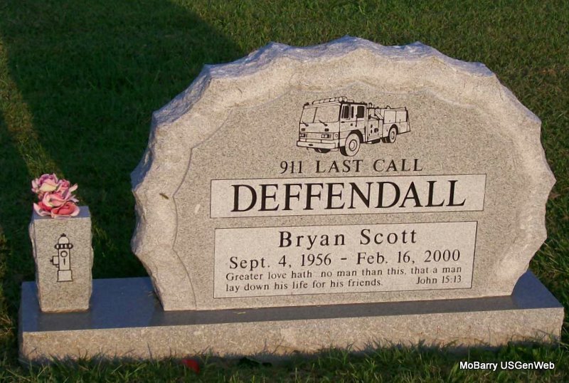 Research Note: Bryan Scott Deffendall, age 43, of Monett, died Feb. 16, 2000, at his home following a long illness. He was born Sept. 4, 1956, in Detroit, Michigan. He moved to Monett in 1994 from California. He had been a fire fighter for 27 years and a member of the Monett Fire Department for the past six years. He was city fire inspector for Monett. He was a member of the First Baptist Church in Monett and the Missouri Fire fighter's Association. He married Denise Aguilera on June 30, 1979, in Westminster, CA and he was preceded in death by his father, Ralph Neil Deffendall. His mother was Frannie Mae Barnett. - Back of Stone | Monett Times Feb. 16, 2000 Mary Homesley Note Donna Cooper Photos Jay Trace |