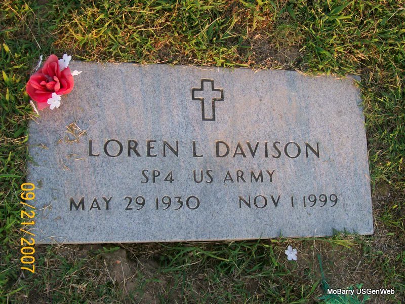 Inscription: "SP4 US ARMY" - Research Note: Loren "Slim" Davison, age 69, of Monett, died at November 1, 1999, at Cox Monett Hospital following a sudden illness. He was born May 29, 1930, in Conway, the son of Roy Fernando and Iva Mae (Rhoten) Davison. He was owner of Monett City Cab, a veteran of the Korean conflict, a ham radio operator, a lifetime member of the National Rifle Association, and a member of New Freedom Worship Center in Purdy. He married Sharon Beckett on December 7, 1990, in Springfield, MO, and was preceded in death by one son, Loren Eugene Davison, Sr. on December 25, 1985; and one brother, Leon Davison. | Monett Times Nov. 3, 1999 Donna Cooper Photos Jay Trace |