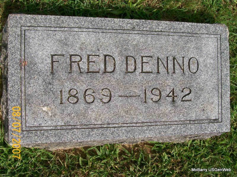 Research Note: According to his death certificate Lillian Sirois Denno, age 69 was his wife's name. Mitchell Denno/ Deneau was his father's name and Matilda La Breck was his mother's name. The cause of death was a cerebral hemorrhage. He had lived in the community for 33 years. Mrs. Fred Denno, 601 Lincoln Ave., Monett, MO, was the informant. | Death Certificate Donna Cooper Photo Jay Trace |