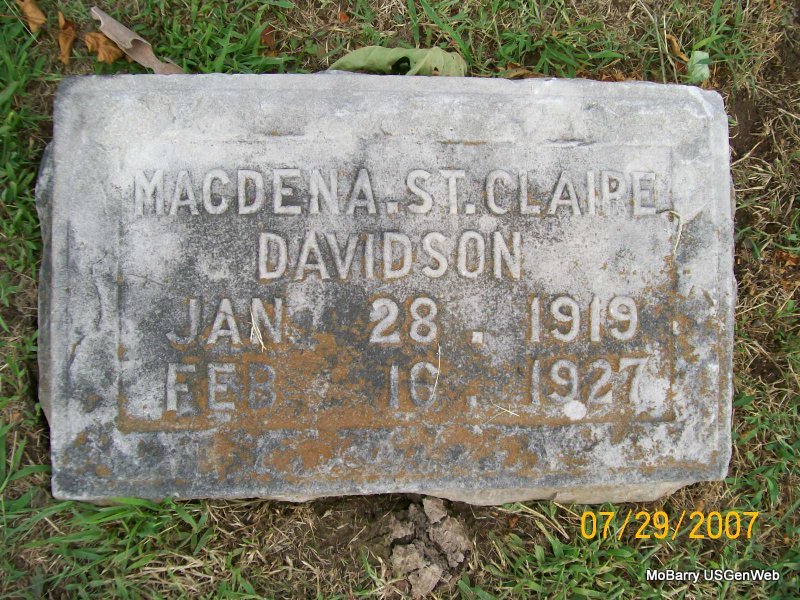 Research Note: Her death certificate listed C. F. Davidson, born Greenville, SC and McDena Smith, born Tallapoosa, GA, as her mother. She was a student and was 8 years, 0 months and 18 days old. The cause of death was mitigates.- Davidson Plot Stone | Death Certificate Donna Cooper Photo Jay Trace |