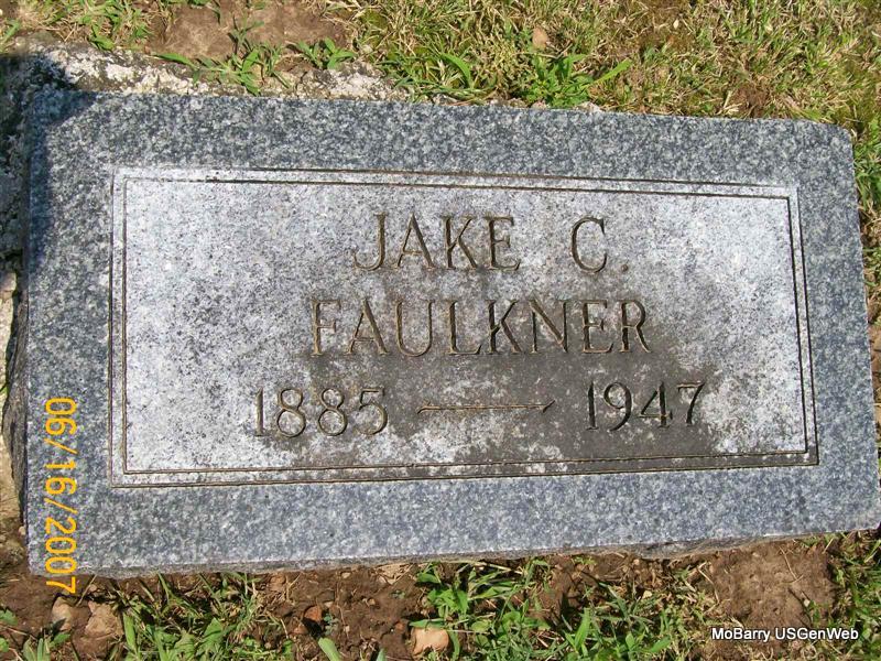 Research Note: His death certificate states William Faulkner was his father and Rebecca Proctor was his mother. The stone reads 1885 for the birth date. Ora Faulkner gave the information. Jake Faulkner, age 24, married Ora Ida Ogle, age 18, on May 2, 1911 in Barry Co., MO. | Death Certificate Donna Cooper MO Marriage Records Phyllis Long Photo Jay Trace |