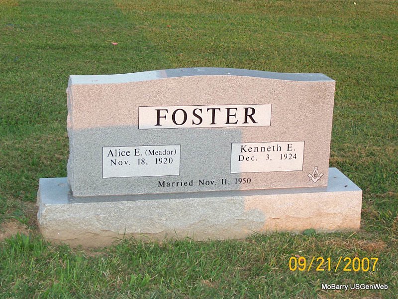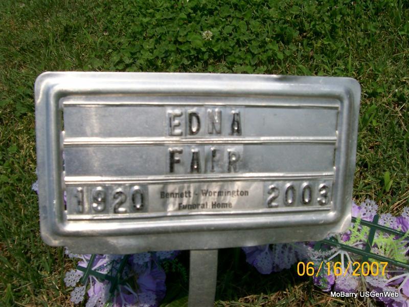 Research Note: Temporary Marker - Buried next to Beauford Elwood Fair, her husband. - Edna Fair, age 82, of Monett, died October 8, 2003, at St. John's Regional Health Center in Springfield. She was born Dec. 5, 1920, in Monett, and was a daughter of L. W. and Mary (Wall) Cramer. She was a teacher and a homemaker. She was a member of the Order of the Eastern Star in Monett. She married Beauford Fair on May 11, 1942, in Wardell, and he preceded her in death Nov. 19, 2000. The IOOF log has that L. W. Cramer purchased the lot and that she has a metal marker NO STONE | Monett Times Donna Cooper Monett Log Book Phyllis Long Photo Jay Trace |