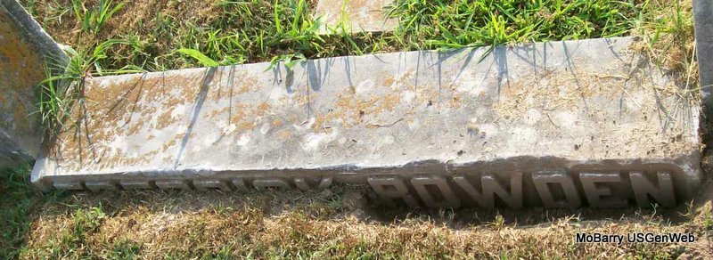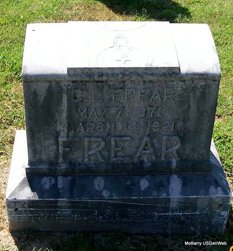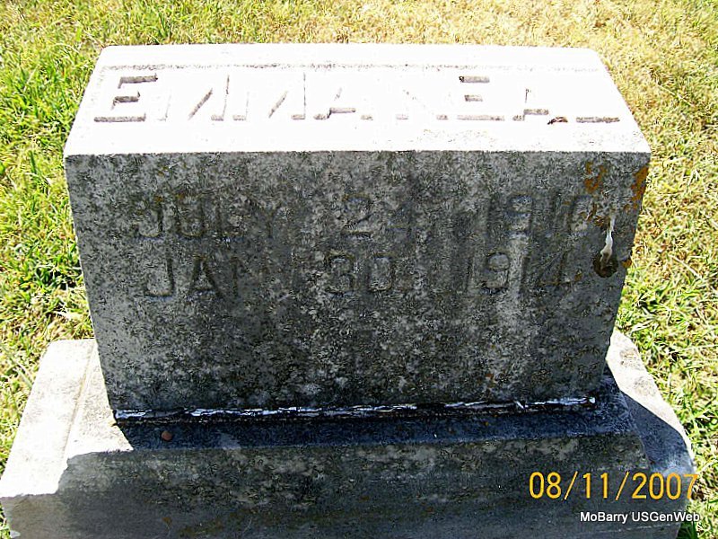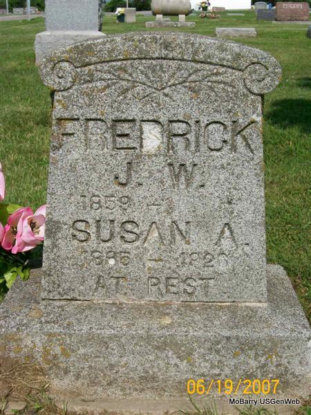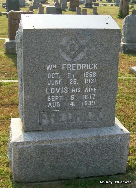 SSW: William - Inscription: "Lovis His Wife" - Research Note: Her death certificate reads that her name was Louisa and husband's name was Carl William Frederick and her birth date was Sept. 7, 1877. She was listed as widowed and no names were given for her parents. The cause of death was given as cerebral hemorrhage, following an operation - hysterectomy. The informant was Mrs. Frank Harris, Galena, MO. She was the daughter of James and Mary Taunton. Louisa Taunton, age 19, married William Fredrick, age 27, on Oct. 4, 1896 in Lawrence Co., MO. - Fredrick and Rowden Plot Stone | Death Certificate Donna Cooper MO Marriage Records Census Phyllis Long Photos Jay Trace |