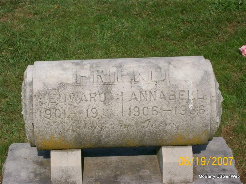 SSW: Edward - Research Note: Her death certificate reads that her name was Anna R. and not Annabell as the stone reads. She was age 29 years, 11 months, 11 days at the time of her death. She was a daughter of George B. Murray born Gainsbury, TN, and Cora (Bradley) Murray born MO. The husband and informant was Rev. Ed Friend. The cause of death was cardiac failure. | Death Certificate Phyllis Long Photo Jay Trace |