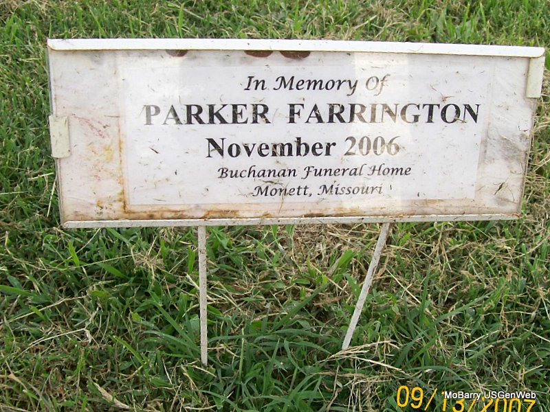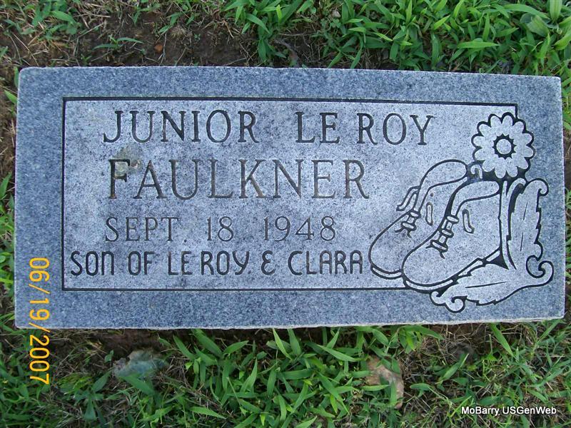 | FAULKNER, Junior LeRoy | No Date | Sept. 18, 1948 | Inscription: "Son of LeRoy and Clara" - Research Note: Son of Leroy Faulkner and Clara Mae Scott, buried at Mt. Hope Cemetery in Webb City, Jasper Co., MO. | Clara's Obit Phyllis Long Photo Jay Trace |