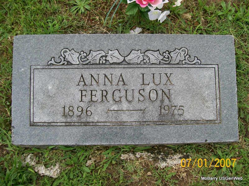 | FERGUSON, Anna (LUX) | 1896 | 1975 | Research Note: Buried between Arneeda (Lux) Schrader, her sister, and John Ferguson, her husband. Daughter of Lewis and Caroline Lux. | Census Phyllis Long Photo Jay Trace |