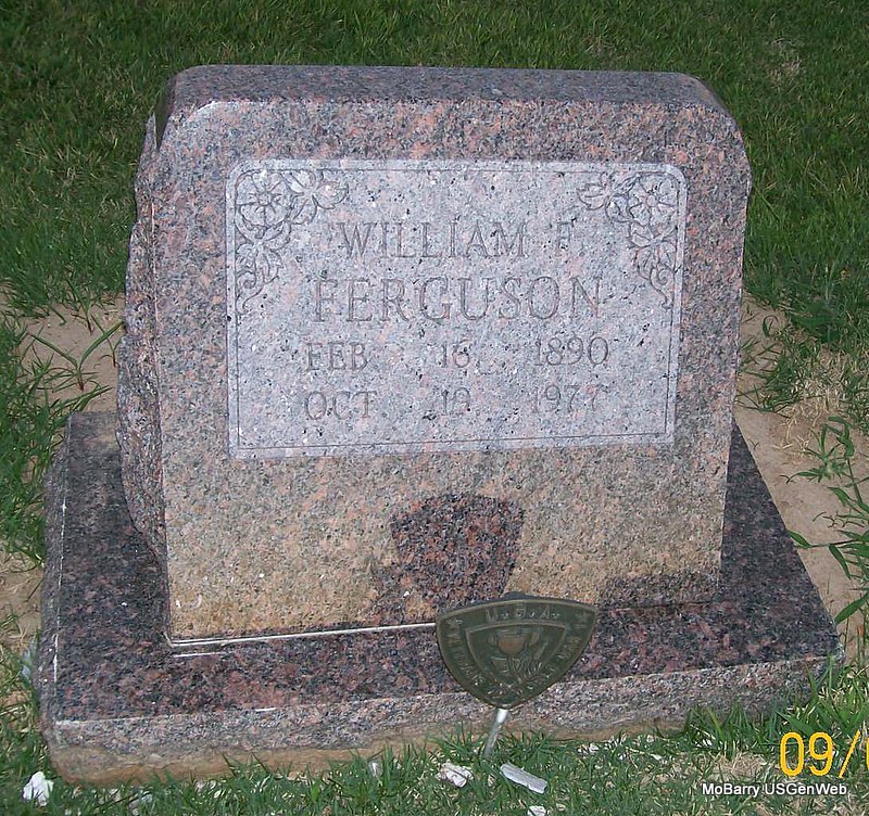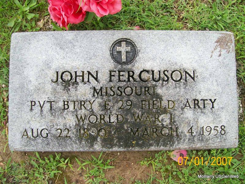 Inscription: "MISSOURI PVT BTRY E 29 FIELD ARTY WORLD WAR I" - Research Note: He is buried next to Anna (Lux) Ferguson, his wife. Son of Phelps Ferguson and Martha Coker. He worked at the Hercules Powder Co. | Death Certificate Phyllis Long Photo Jay Trace |