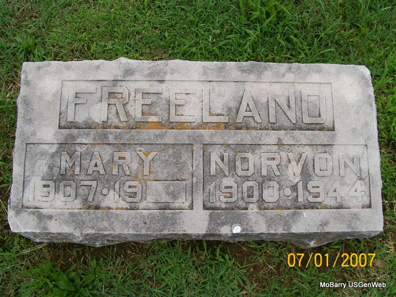 SSW: Mary - Research Note: His death certificate gives his name as Norvan but the SOS web site has it indexed as Norman. He was a son of Norvon Freeland, born Monroe, IL and Adelia Fields, born Iowa. He was a radio repairman. He had been married one time and was divorced. The cause of death was lobar pneumonia. His regular address was 213 Broadway, Monett, MO and the hospital was the informant. Census gives his father as Napoleon Blaine Freeland. His first wife was Edith Parks. She second married Charles H. West. | Death Certificate Donna Cooper Census Phyllis Long Photo Jay Trace |