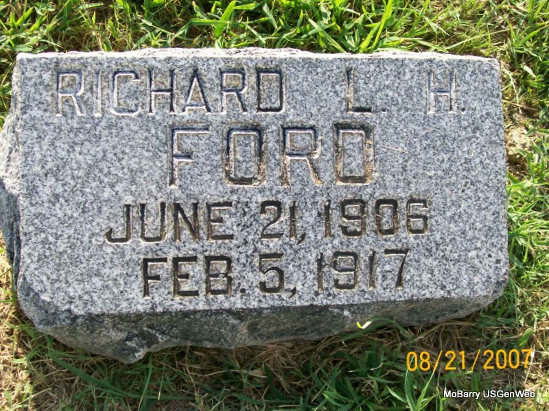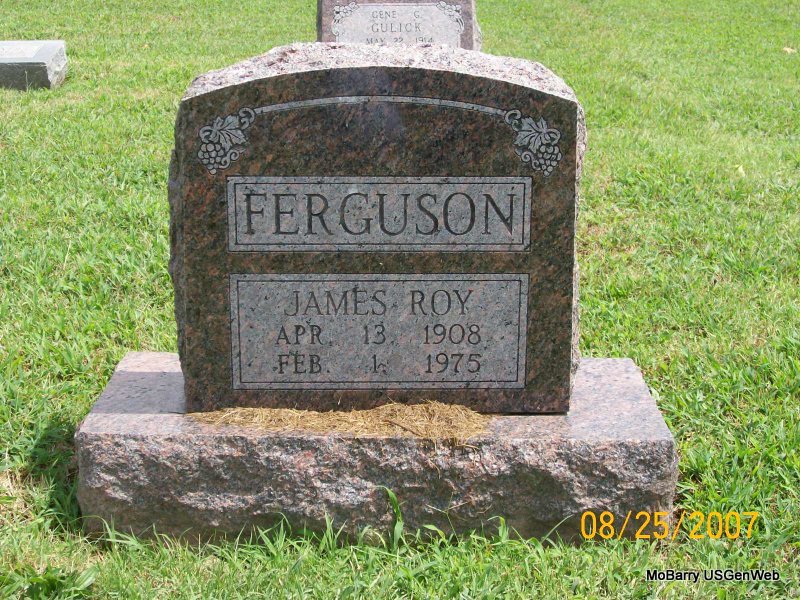 | FERGUSON, James Roy | Apr. 13, 1908 | Feb. 1, 1975 | Research Note: Son of James William Ferguson and Emily Permitney Mae Holder. - 1940 Census, Monett, Barry, Missouri - James R. Ferguson, head, age 31, born MO; Itrice, wife, age 24, born MO; Jerry L., son, age 4, born MO; Richard G., son, age 2, born MO. | Census Phyllis Long Photo Jay Trace |