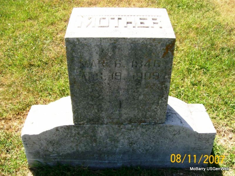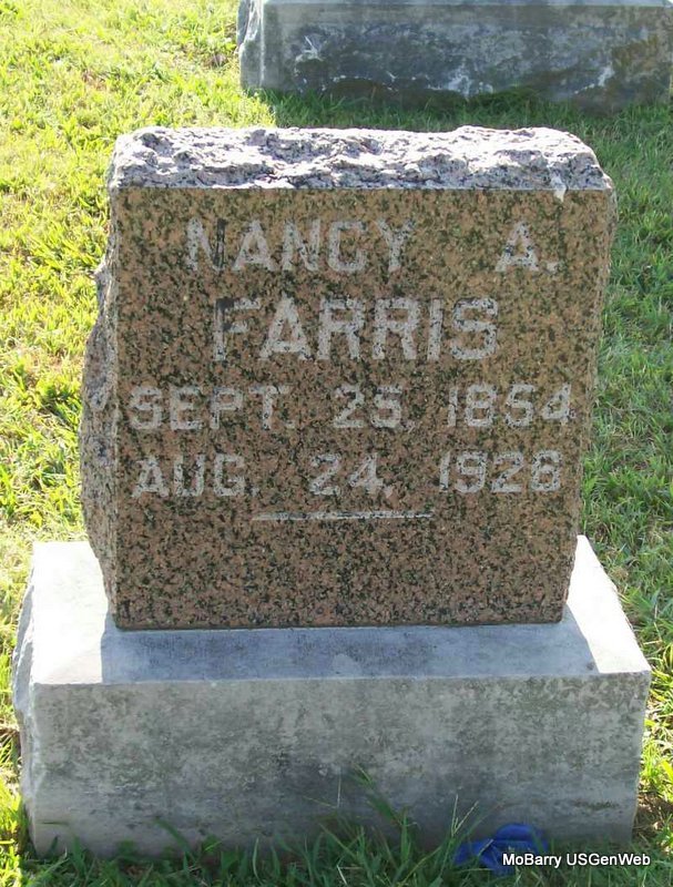 Research Note: Her death certificate states that Dempsey Jackson was her father, born TN, and her mother was Minerva Bryan, born TN, as her mother. The cause of death was cancer. Mrs. Hoover was the informant. She is buried next to Maggie Rowan, her sister and has a matching stone to hers. William D. Farris married Nancy Ann Jackson on Oct. 5, 1869 in Laclede Co., MO. | Death Certificate Donna Cooper MO Marriage Records Phyllis Long Photo Jay Trace |