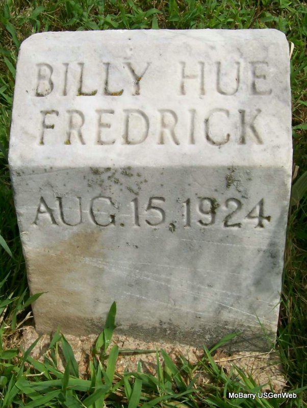 Research Note: His death certificate reads that his father was named Elmer Frederick and his mother was Laura Frederick. His usual address was given as South Kyler St., Monett, MO. He died from the effects of a bowel obstruction. His father's stone has his name spelled Fredrick and not Frederick as the death certificate has it. | Death Certificate Donna Cooper Photo Jay Trace |