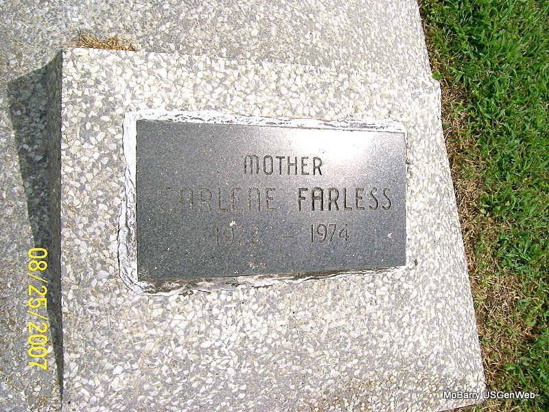 | FARLESS, Carlene | 1922 | 1974 | Inscription: "Mother" - Research Note: She is buried next to Lorene Johnson and has a matching stone to hers. | Note Donna Cooper Photo Jay Trace |