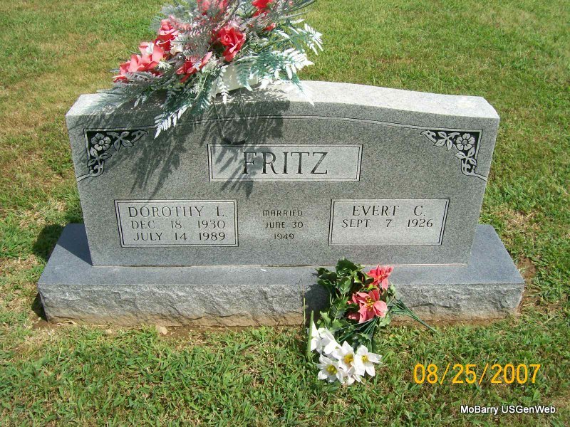 SSW: SSW: Dorothy L. - Inscription: "Married June 30, 1949" - Research Note: Son of Harold Emil Fritz and Dora Louise Emma Doennig. He was united in marriage to his first wife, Dorothy L. Ash, on June 30, 1949; she preceded him in death on July 14, 1989. He later married Julia K. (Gasser) Cendroski on Nov. 2, 1991; she preceded him in death on Apr. 25, 2023. Evert was retired from both Schreiber Foods and Jumping Jacks Shoes; a veteran of the United States Navy Seabees serving during World War II, a Life Member of the American Legion and a founding member of St. John's Lutheran Church, in Monett. He was a dedicated servant to his God, family, friends and community. He enjoyed carpentry and fixing things but his favorite past-times were watching the St. Louis Cardinals, gardening and fishing. Evert is survived by a daughter; a son; seven grandchildren; eight great-grandchildren; numerous nieces and nephews; a step-son; a step-daughter; four step-grandchildren and one step-great grandchild. Evert was preceded in death by his parents; two wives; two daughters, Mary Fritz and Karen Fritz; and three brothers Nolan, Delmer and Orbin Fritz. - Back of Stone | Buchanan Funeral Home L.Pearce Findagrave Census Phyllis Long Photos Jay Trace |