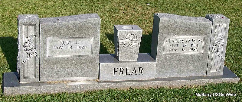 Research Note: Her death certificated has her father as William Frederick, born Germany, and her mother's maiden name was Fenton, born Pierce City, MO. - Fredrick and Rowden Plot Stone | Death Certificate Donna Cooper Photo Jay Trace |