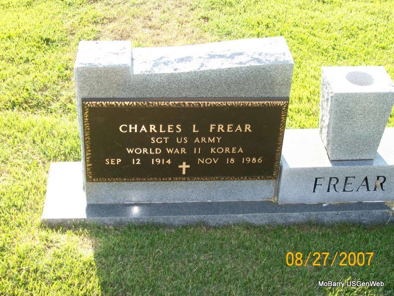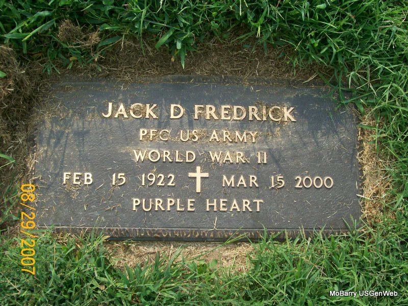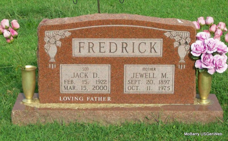 SSW: Jewell M. - Inscription: "Son - Loving Father" - Research Note: Army veteran of World War II. Diana Fredrick was his wife's name at the time of his death. His mother was Jewel Richardson. Grandson of Kemp and Edith Richardson. Jack Denna Fredrick, age 39, born Feb. 15, 1922, married Diana Jean Wright, age 33, born Mar. 21, 1928, on Apr. 8, 1961 in Harrisonville, Cass Co., MO. - Military Stone - Inscription: "PFC US ARMY WORLD WAR II - PURPLE HEART" | Monett Times, Mar. 22, 2000 Mary Homesley MO Marriage Records Census Phyllis Long Photos Jay Trace |