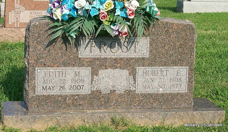 SSW: Hubert E. - Research Note: Services for Edith Frost, age 97, of Monett, who died May 26, were held at 3 p.m. yesterday, May 30th, at the First Baptist Church in Monett with Rev. Ed Burris and Dr. Bill Cox officiating. Music was provided by soloist Jack Frost who sang In My fathers House Are Many Memories. Pianist was Miss Miller and organist was Mary Ann Cox. Casket bearers were Mike Larmer, Dennis Schoon, Carl Stark, Lee McCormick, Jerry Ragsdale, and Bob Cole. Burial was in Monett IOOF Cemetery under the direction of Buchanan Funeral Home of Monett. Phyllis' Note: Her obituary reads that her father was A. J. Martin and her mother Minnie Burden. Her husband was Hubert Frost and they married 1925 in Roanoke, AL. | Monett Times Donna Cooper Obit Phyllis Long Photo Jay Trace |