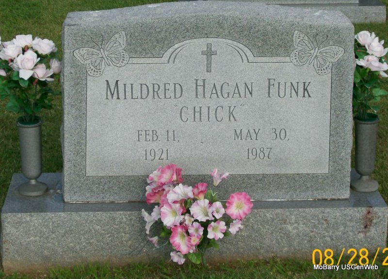 | FUNK, Mildred "Chick" (HAGAN) | Feb. 11, 1921 | May 30, 1987 | Research Note: The log book reads that the lot owners were Harry E. and Mildred Funk. The funeral home was Eddie Birland of Osatomic, Kansas. Daughter of Sterling Efton Hagan and Johanna Herbertina Genett Dahlaus. | IOOF Log Book Census Phyllis Long Photo Jay Trace |