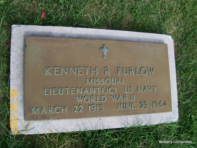 Inscription: "MISSOURI LIEUTENANT (JG) US NAVY WORLD WAR II" - Research Note: Son of Elijah Furlow and Bertha Maxwell. - 1940 census, his wife is Matilda. - 1940 Census, Vallejo, Solano, California - Kenneth R. Furlow, head, age 27, born MO, U.S.N., store keeper at Mare Island; Matilda, wife, age 20, born VA. Death certificate gives his wife as Julia May Furlow. Mrs. Steele of Dugginsville, MO was the informant on the death certificate. | Census Death Certificate Phyllis Long Photo Jay Trace |