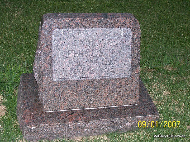 Research Note: She is buried next to William Ferguson and was mentioned as his wife in her son, Charles Ferguson's, obit of Nov. 2001. Laura E. Allcock, age 20, first married Daniel Carlyle Long, age 32, on Aug. 15, 1913 in Cassville, Barry Co., MO. Widowed by 1920 Census. Second married William Franklin Ferguson. Daughter of Jonathan Pryor Allcock and Nancy Elizabeth Bennett. Mrs. Taylor Hopkins of Monett, MO was the informant on the death certificate. | Note Donna Cooper MO Marriage Records Census Death Certificate Phyllis Long Photo Jay Trace |