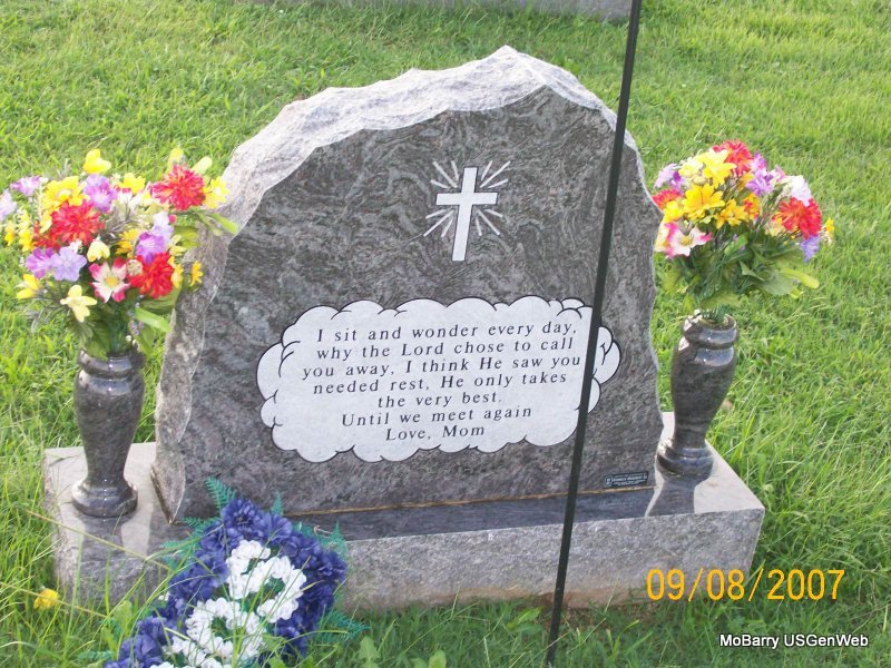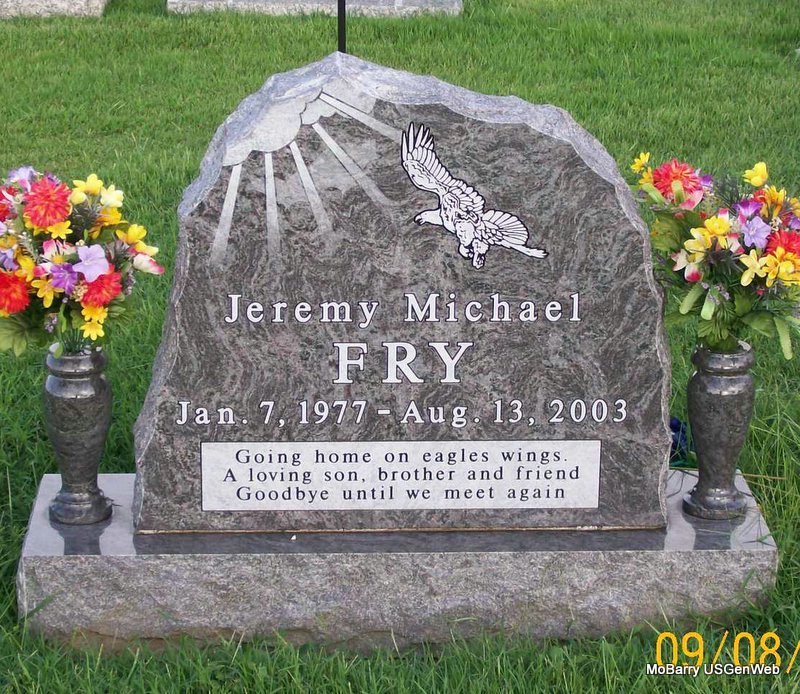 Research Note: Jeremy Michael Fry, age 26, of Monett, died at 5:24 p.m. August 13, 2003, at Cox Monett Hospital. He was born January 7, 1977, in Miami, Oklahoma. He was a member of New Site Baptist Church near Monett. Son of Stephen Fry and Shirley Marshall. - Back of Stone | Monett Times, Aug. 13, 2003 Donna Cooper Photo Jay Trace |