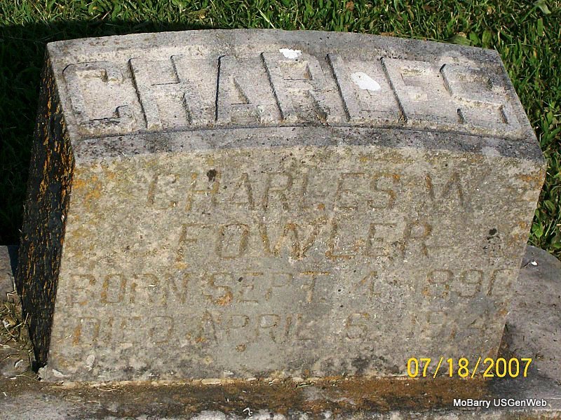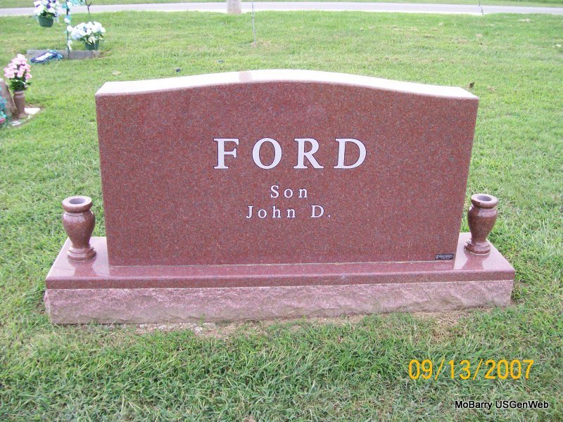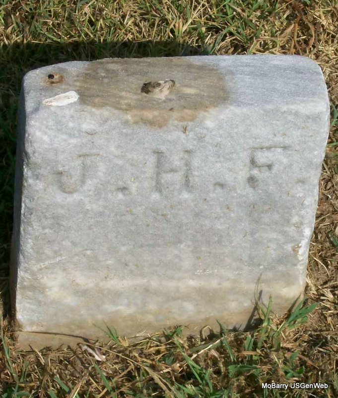 Research Note: This stone reads J. H. F. and is next to P. Fletcher Ferguson's stone, and has no dates. It appears to possibly be a footstone. It is in the old section, in block 65, lot 3, grave 1, in the S 1/2. He was buried Feb. 5, 1906 and Mrs. Ferguson purchased the lot. The log book has this stone logged for John H. Ferguson. Callaway Funeral Home logged him as John Hugh Ferguson. His death was caused from typhoid fever and he was buried Feb. 6, 1906 and died on the 4th at the railroad hospital in Springfield, MO, and was a railroad fireman. He was married, and 31 years and 3 days old. Son of Lewis Coleman Ferguson and Nancy M. Stewart. John H. Ferguson married Lulu Belle Withers on July 8, 1901 in Barry Co., MO. | Death Certificate Donna Cooper IOOF Log Book Census MO Marriage Records Phyllis Long Photo Jay Trace |