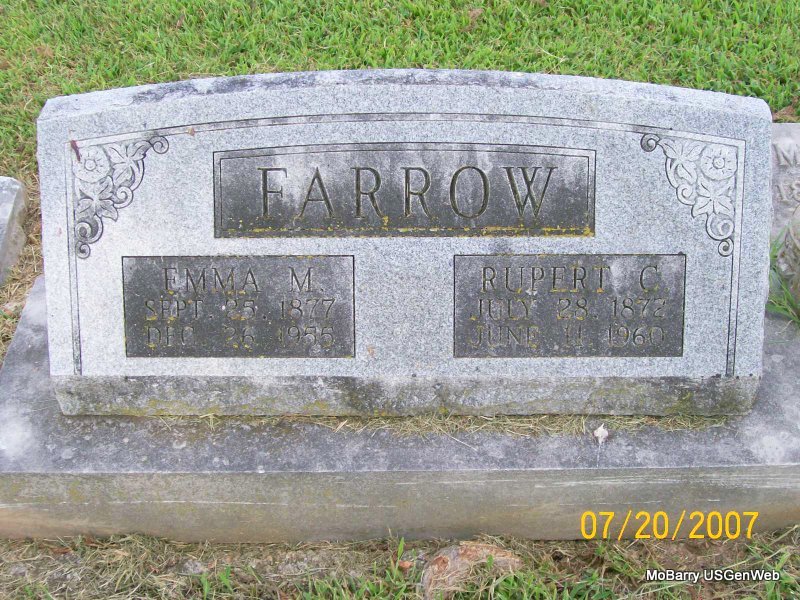 SSW: Rupert C. - Her death certificate reads she was age 78 years, 3 months and 1 day old at the time of her death. Her father is given as John Clinton and her mother as Mary Nelms. She was married and a housewife. Her husband was given as Rupert C. Farrow. The informant was Rupert C. Farrow, Monett, MO. Death Certificate Number: 39593 - Rupert Farrow, age 29, married Emma Clinton, age 23, on May 21, 1901 in Barry Co., MO. - Another Photo | Death Certificate Diana Cope MO Marriage Records Phyllis Long Photo Donna Cooper Photo Jay Trace |
