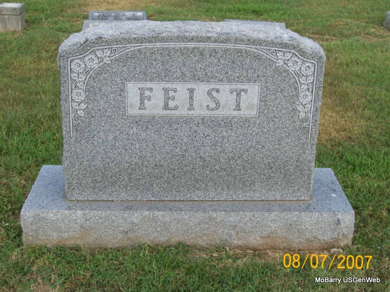 Research Note: According to his death certificate his cause of death was coronary thrombosis, prostrate deformity. He was in the hospital 8 weeks. He was widowed two times and his wife's name was Minnie Feist. At the time of his death he was age 78 years, 2 months and 24 days old. He was a retired railway express messenger. His father was Michael Feist, born Germany and his mother was Theresa Whitney born Germany. His usual address was Monett, MO and Miss Ruth Feist, 20 W. 36th St., was the informant. - Feist Plot Stone | Photo Death Certificate Donna Cooper Photos Jay Trace |