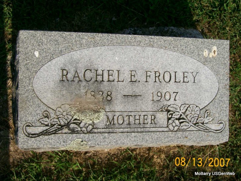 Inscription: "Mother" - Research Note: First husband was Thomas Frolley. - 1870 Census, Mount Vernon, Lawrence, Missouri - Rachel Frolley, age 32, born TN; John W., age 8, born MO; Sarah C., age 6, born MO. - Rachel Froley married Isaac Lewis on Oct. 3, 1875 in Lawrence Co., MO. Daughter of Timothy Pennington and Sarah Ann "Sally" Johnson. | Census MO Marriage Records Phyllis Long Photo Jay Trace |