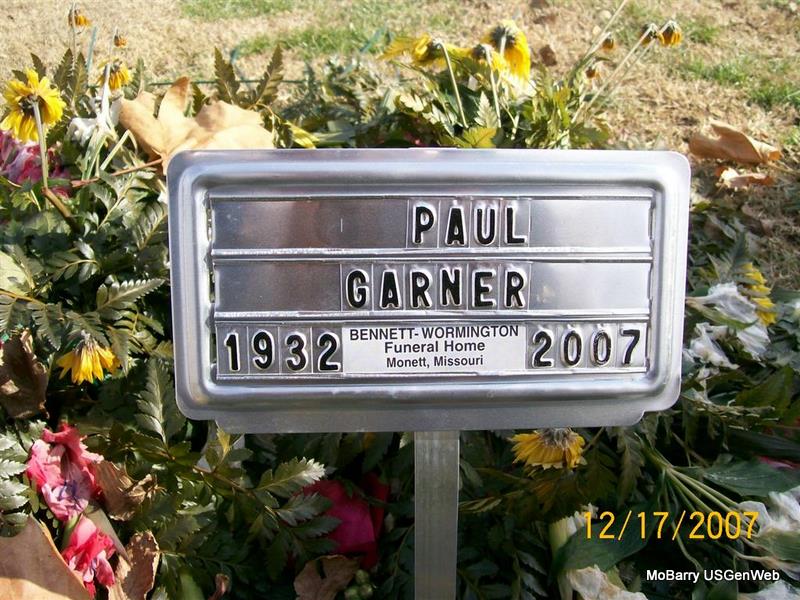SSW: Florine A. - Research Note: He was a son of Nelson and Gertrude (Reno) Garner. He married Florine Probstfield on September 11, 1965, in Santa Paula, CA. He was preceded in death by two brothers, Don Garner and Nelson Garner Jr.; and three sisters, Ann McGill, Merle Ferguson, and Edith Ferguson. He was a retired printer for Marsh Engineering in Monett. - Another Photo | Monett Times Photos Jay Trace |