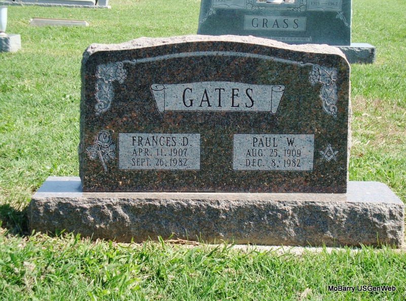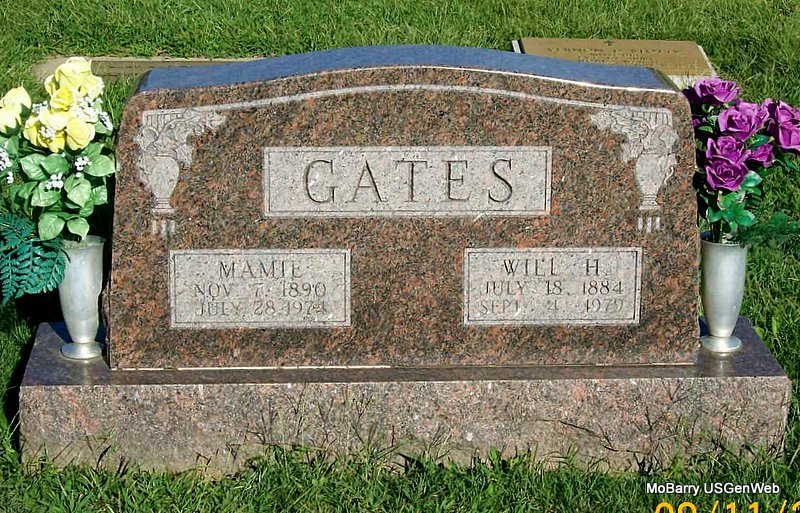 | GATES, Mamie Gladys (HENDERSON) | Nov. 7, 1890 | July 28, 1974 | SSW: Will H. - Research Note: Daughter of Siegel General Henderson and Lou Emma Smith. Mamie Henderson, age 20, married Will H. Gates, age 28, on Aug. 14, 1912 in Barry Co., MO. | MO Marriage Records Census Phyllis Long Photo Jay Trace |