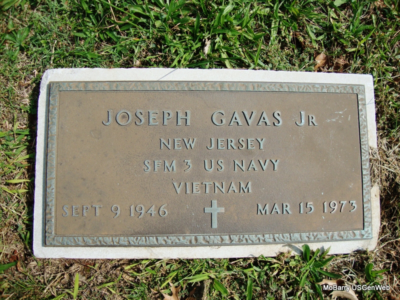 | GAVAS, Joseph Jr. | Sept. 9, 1946 | Mar. 15, 1973 | Inscription: "New Jersey SFM 3 US NAVY, VIETNAM" - Research Note: He is buried in the 2nd section, in block 73, a single lot, in grave 8 and was buried Mar. 15, 1973, according to the cemetery log book of the City of Monett. SSN issued in New Jersey. | Note Donna Cooper IOOF Log Book SSDI Phyllis Long Photo Connie Schmidt |