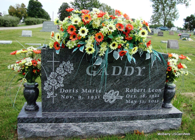 SSW: Doris Marie - Inscription: "Married Mar. 31, 1946" - Research Note: He was the son of William and Otha (Garner) Gaddy, the youngest of seven children. His family moved to Monett, MO in 1930. He graduated from Monett High School in 1940 and proudly served his country during World War II in the U.S. Coast Guard Merchant Marines. On March 31, 1946 he married the love of his life, Doris, and to this union, three children were born. Robert moved his family to Springfield, MO in 1964. Robert retired from Frisco Transportation. He was preceded in death by his parents, siblings and infant daughter, Julia. | Gorman-Scharpf Funeral Home Phyllis Long Photo Connie Schmidt |
