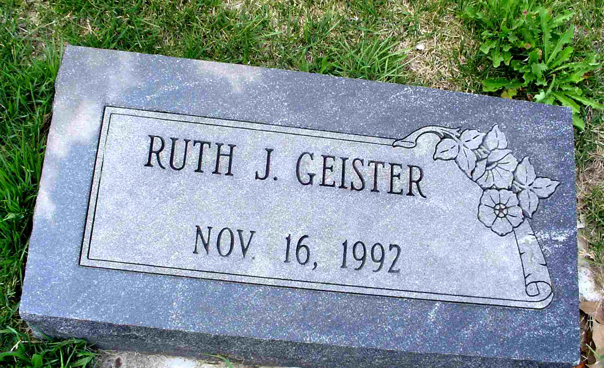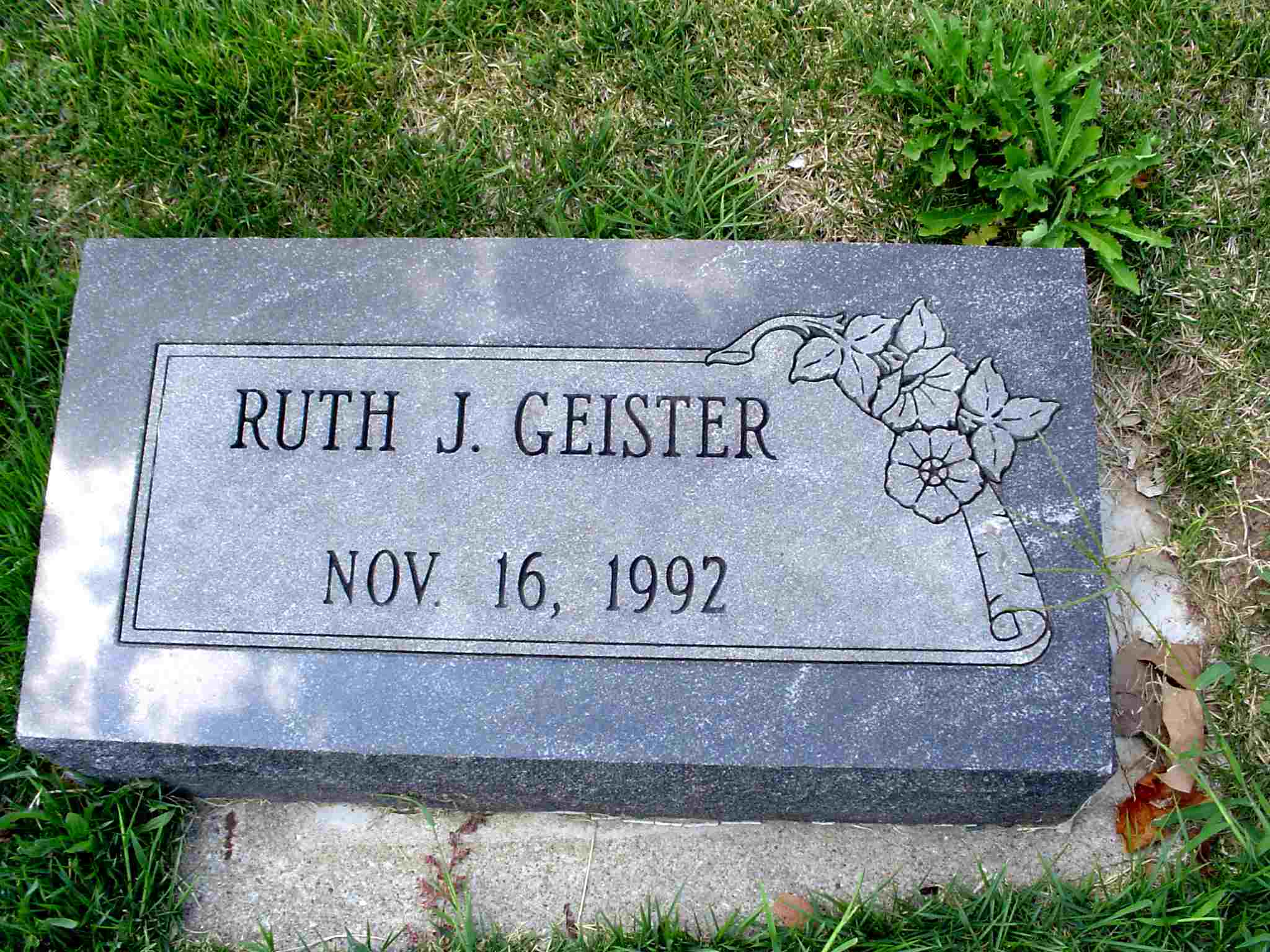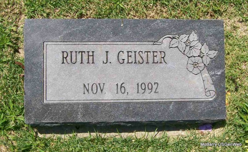 | GEISTER, Ruth J. (FLY) | Mar. 25, 1904 | Nov. 16, 1992 | Research Note: This may not be the right Ruth. Taken from SS records. Her death date at SS given as Sept. 1978. Last Residence Monett, MO. Daughter of Henry Wilson Fly and Maude Moore. Wife of George M. Geister. Ruth J. Fly married George M. Geister on Mar. 1, 1923 in Neosho, Newton Co., MO. - Another Photo - Geister Plot - Another Photo | Census MO Marriage Records Phyllis Long Photo Donna Cooper Photo Jay Trace |