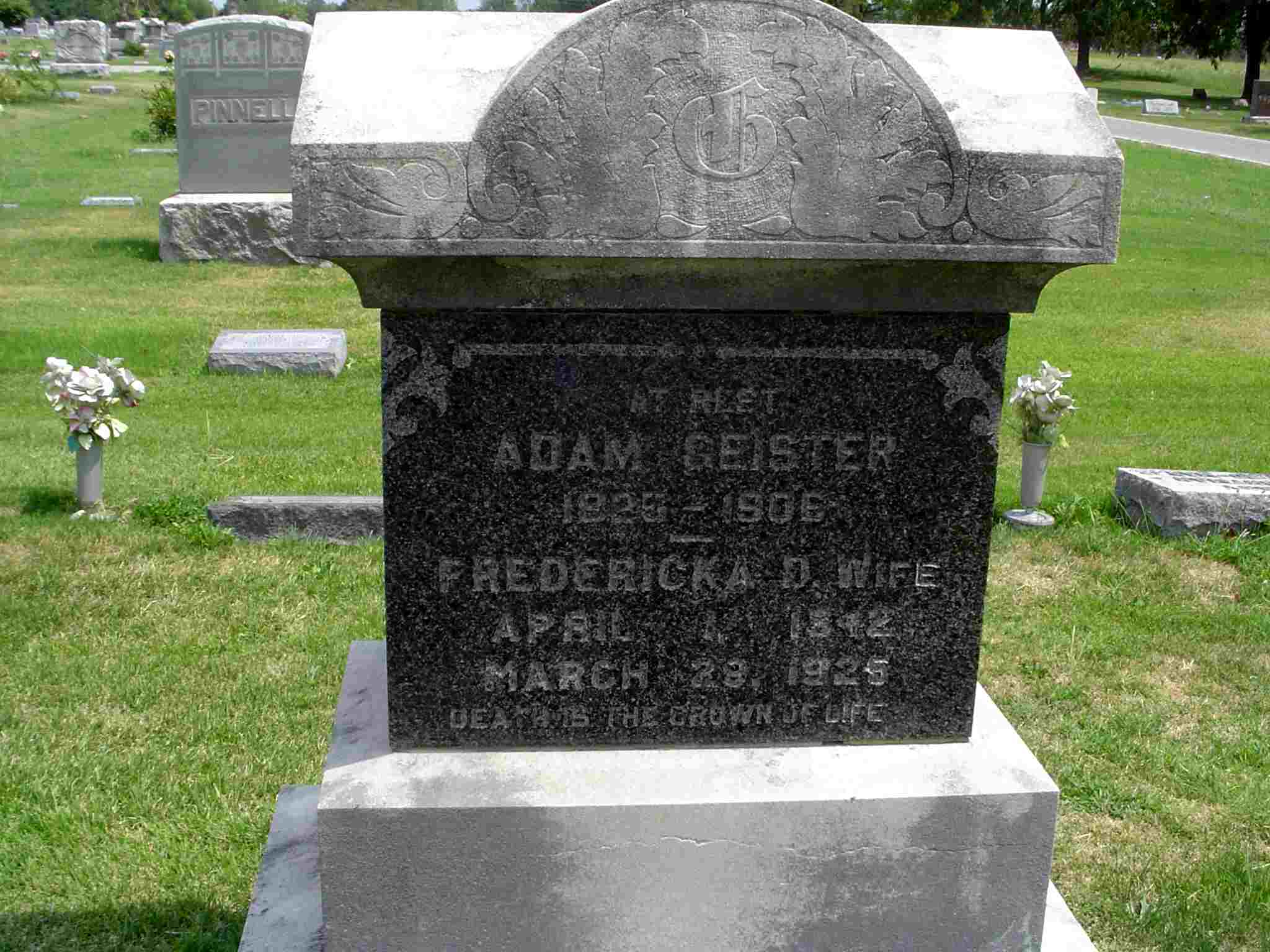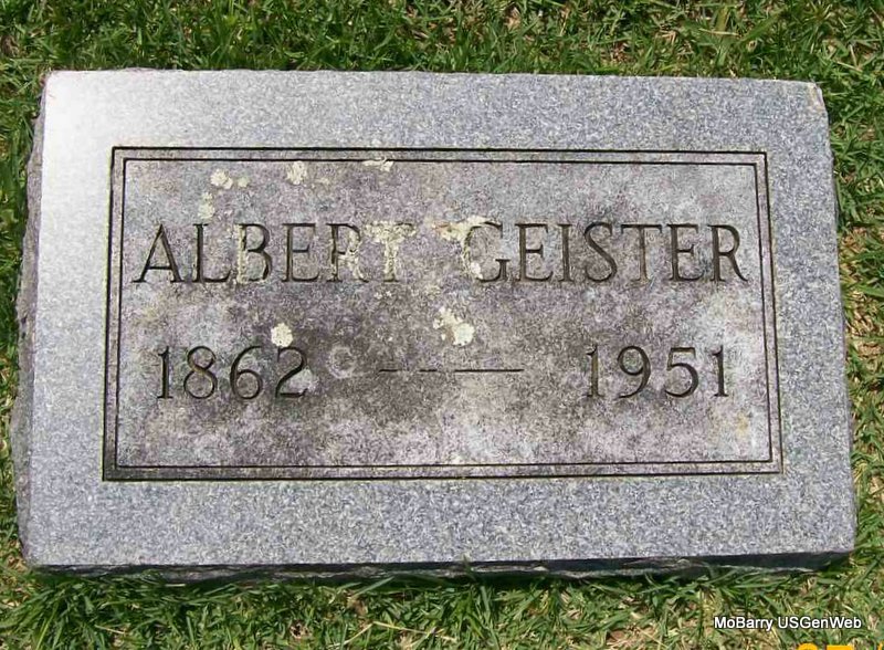 Research Note: His death certificate states he was age 89 years, 9 months and 14 days old at the time of his death. The cause of death was given as uremia; prostatic hypertrophy; arteriosclerosis. His father was listed as Adam Geister and his mother was F. Schein (Fredrika Scheihing). He was married to Garnet B. and he was a Frisco Railroad engineer. The informants were Fae and George Geister, Monett, MO - Death Certificate Number: 36291 - Geister Plot - Another Photo | Photo Donna Cooper Death Certificate Diana (Anderson) Cope Photos Jay Trace |