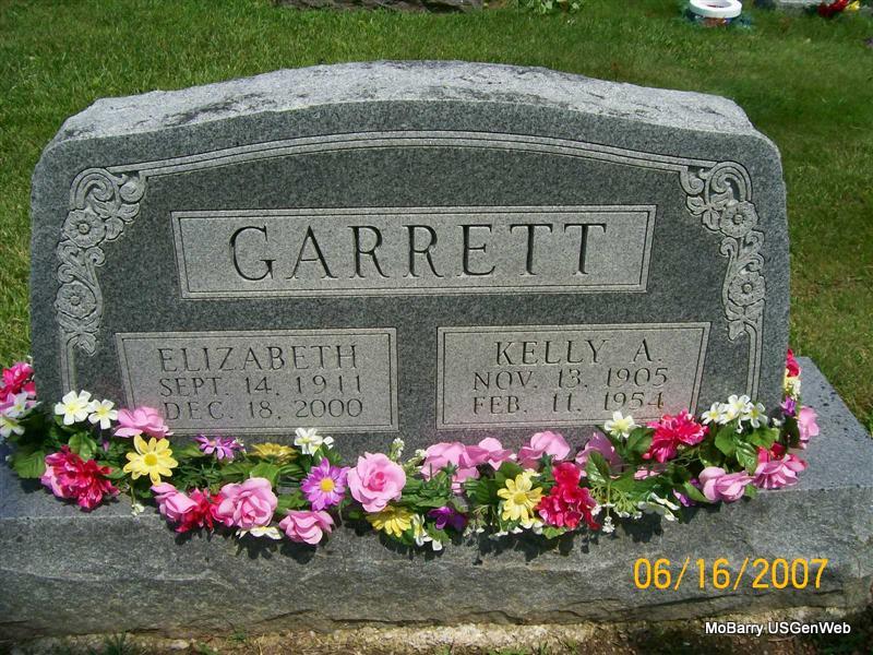 SSW: Kelly A. - Research Note: Elizabeth Garrett "Gee Gee" Roth, age 89, of Monett, died at her home following a long illness. She was born Sept. 14, 1911, in St. Clair Co., MO, and was a daughter of the first generation of Swiss parents, John and Ruth (Neuenschwander) Klass. She attended the one-room Valley Center School in St. Clair County through the eighth grade and graduated from high school in California, MO, in 1929, where she was a scholar-athlete and All-Star basketball player. She married Kelly Andrew Garrett on July 22, 1939, and he preceded her in death Feb. 13, 1954. Elizabeth Marie Garrett, age 65, married John Henry Roth, age 68, on Oct. 2, 1976 in Cole, Jefferson Co., MO. Her obit was under the name of Roth and her stone under the name of Garrett. | Obit Donna Cooper Photo Jay Trace |