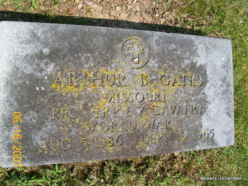 SSW: Addie H. - Inscription: "MISSOURI PFC TRP E 7 CAVALRY WORLD WAR I" - Research Note: His wife was Addie Helen. Son of Albert Fuller Gates and Florence Augusta Tolles. - Military Stone | Census Phyllis Long Photos Jay Trace |