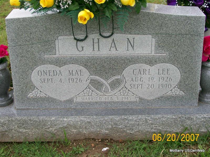 | GHAN, Carl Lee | Aug. 19, 1926 | Sept. 20, 1990 | SSW: Oneda Mae - Inscription: "Married Feb. 3, 1945" - Research Note: Son of Luther Daniel Ghan and Leona Irene Herrell. - Back of Stone | Census Phyllis Long Photos Jay Trace |