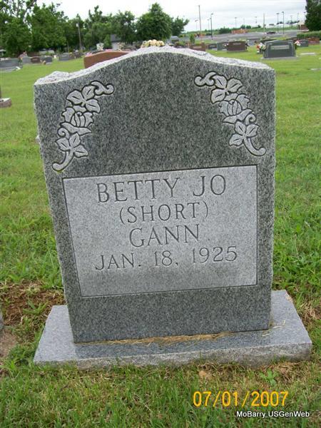 | GANN, Betty Jo (SHORT) | Jan. 18, 1925 | Aug. 7, 2002 | Research Note: She is buried between Ruth (Cox) and Phillip Short, her parents. According to the cemetery log book Alvin Cox purchased the lot. | IOOF Log Book Phyllis Long Photo Jay Trace |
