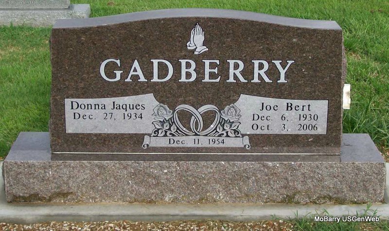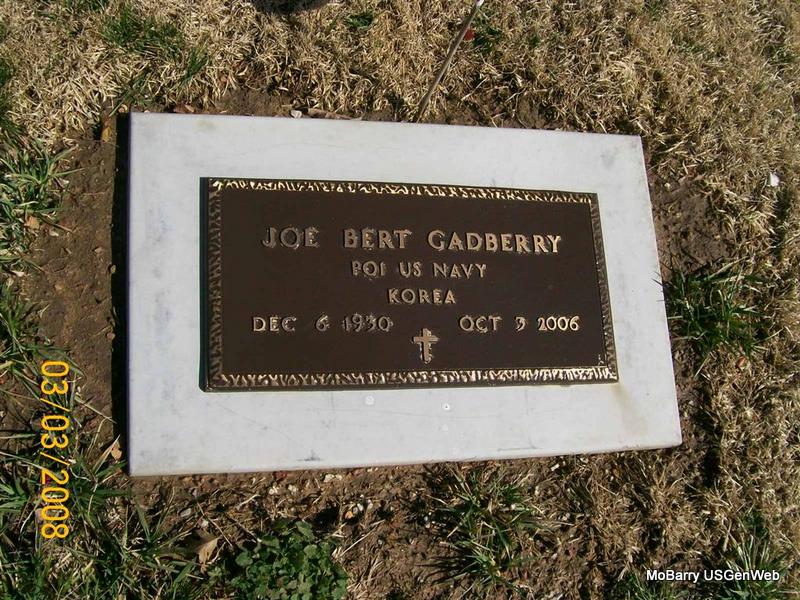 SSW: Donna Jaques - Inscription: "POI US NAVY KOREA" - Research Note: Joe Bert Gadberry, age 75, of Arlington, Texas, died October 3, 2006, in Arlington. He was married to Donna Gadberry and was an accountant. Survivors include two children, five grandchildren, and four great grandchildren. Son of Clarence Hugh Gadberry and Cordelia Woodall. - Another Stone - Back of Stone | Monett Times Oct. 5, 2006 Donna Cooper TX Birth Certificates Phyllis Long Photos Jay Trace |